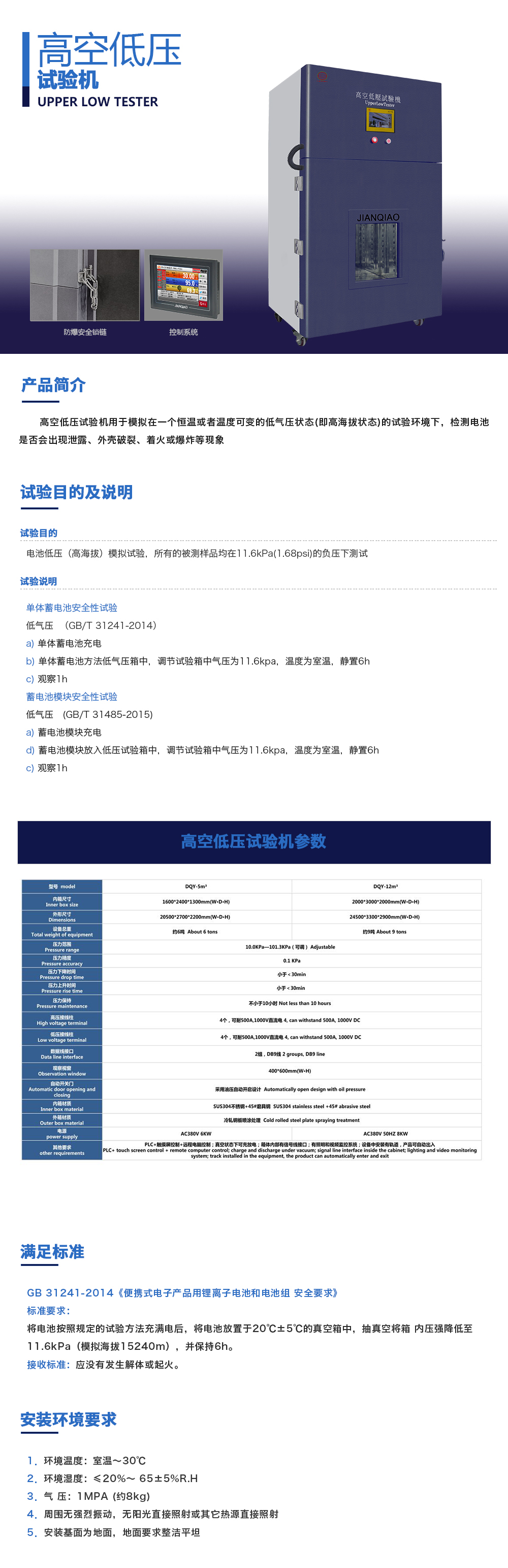 產品型號:JQ-8104(可定制) 品牌:劍 喬 用途:高空低壓試驗機用于模擬在一個恒溫或者溫度可變的低氣壓狀態(tài)(即高海拔狀態(tài))的試驗環(huán)境下,檢測電池是否會出現泄露、外殼破裂、著火或爆炸等現象。咨詢熱線:13829135130
