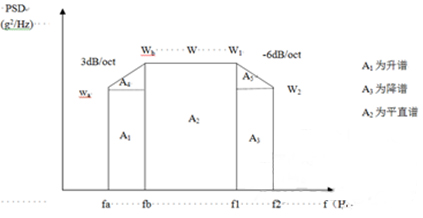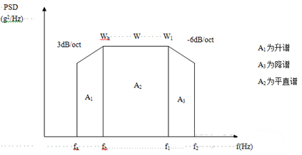 為了簡(jiǎn)便起見,往往將功率譜密度曲線圖劃分成若干矩形和三角形,并利用上升斜率(如3dB/oct)和下降斜率(如-6dB/oct)分別算出wa 和w2,然后求各個(gè)幾何形狀的面積與面積和,再開方求出加速度總均方根值。