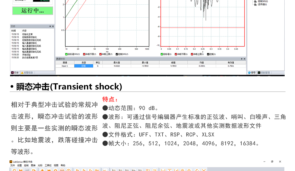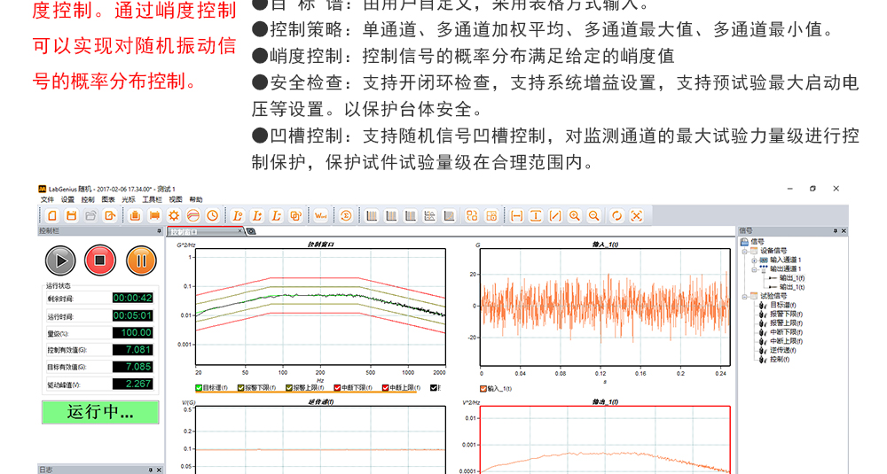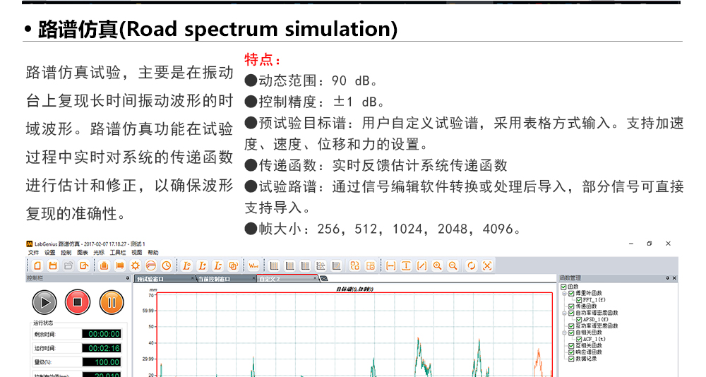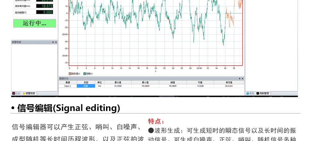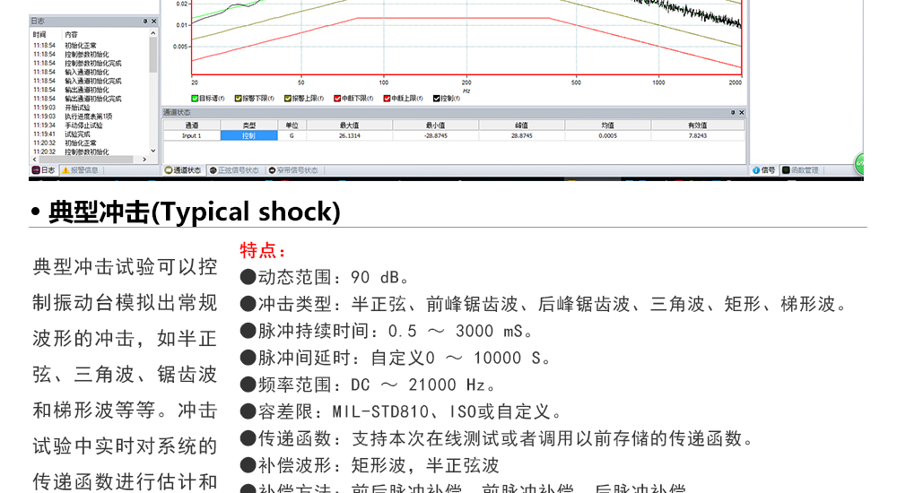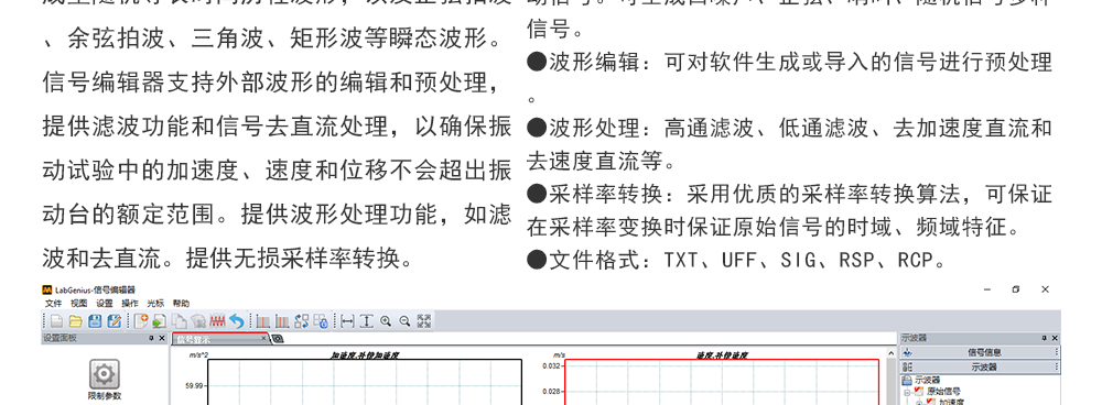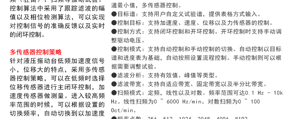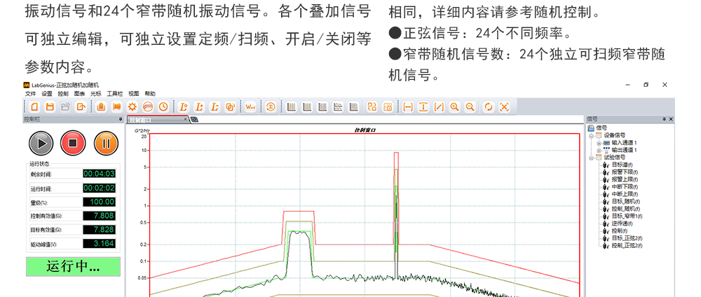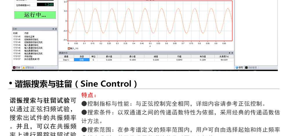用途:正弦試驗(yàn)可以控制振動(dòng)臺(tái)實(shí)現(xiàn)定頻(駐留)、掃頻等振動(dòng)試驗(yàn)。控制算法中采用了跟蹤濾波的幅值以及相位檢測(cè)算法,可以實(shí)現(xiàn)對(duì)控制信號(hào)的準(zhǔn)確反饋以及實(shí)時(shí)的閉環(huán)控制。